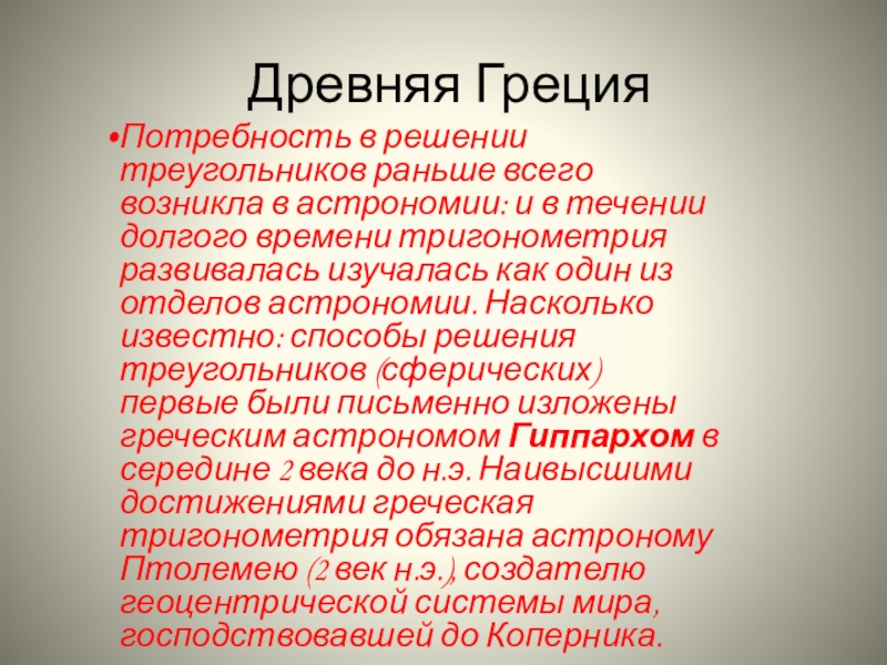 и в течении долгого времени тригонометрия развивалась изучалась как один из отделов астрономии. Насколько известно: способы решения треугольников (сферических) первые были письменно изложены греческим астрономом Гиппархом в середине 2 века до н.э. Наивысшими достижениями греческая тригонометрия обязана астроному Птолемею (2 век н.э.), создателю геоцентрической системы мира, господствовавшей до Коперника.