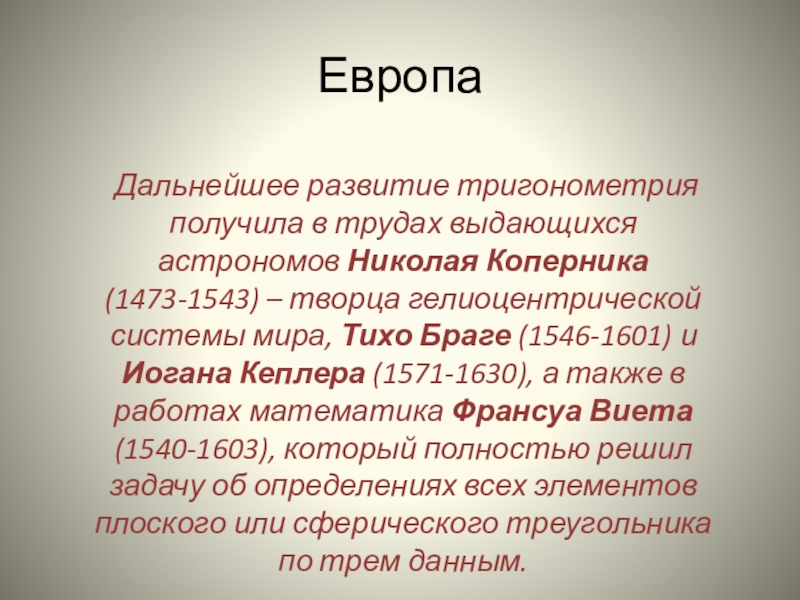 (1473-1543) – творца гелиоцентрической системы мира, Тихо Браге (1546-1601) и Иогана Кеплера (1571-1630), а также в работах математика Франсуа Виета (1540-1603), который полностью решил задачу об определениях всех элементов плоского или сферического треугольника по трем данным.