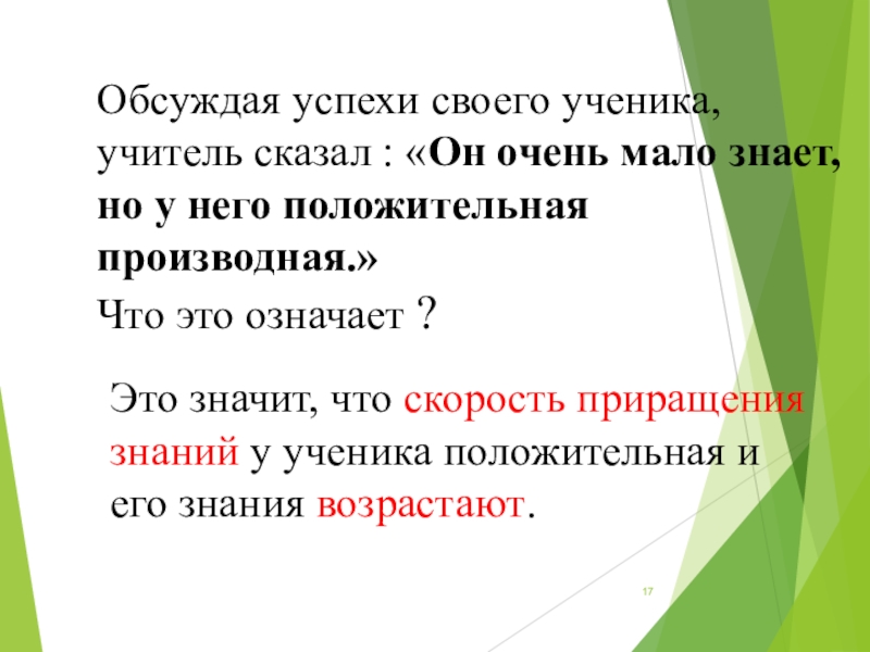 Это значит, что скорость приращения знаний у ученика положительная и его знания возрастают.