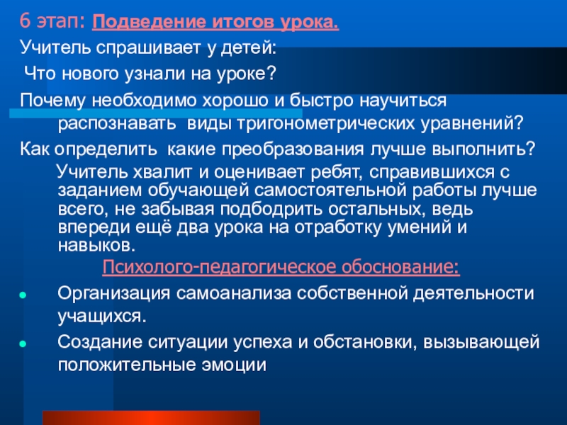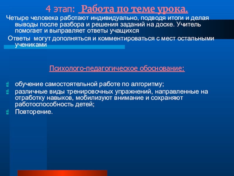 итоги и делая выводы после разбора и решения заданий на доске. Учитель помогает и выправляет ответы учащихся