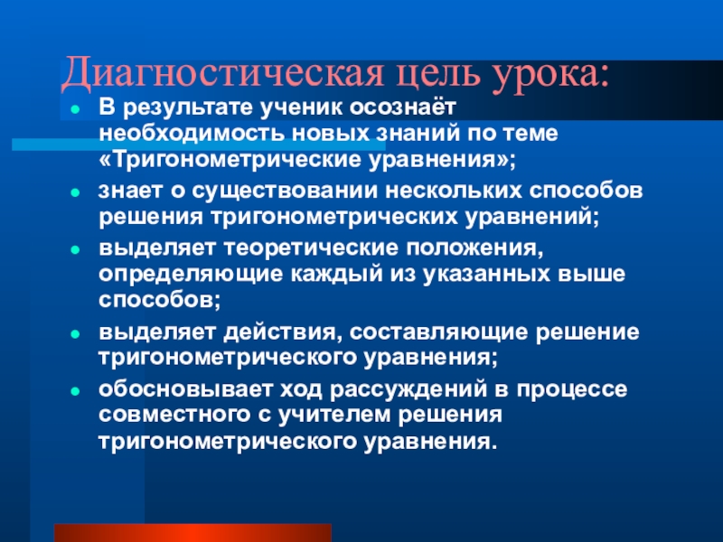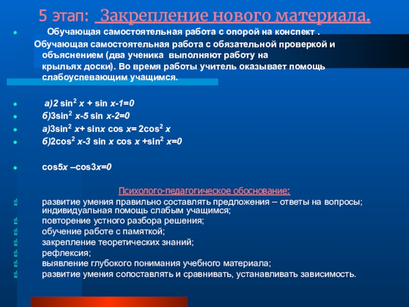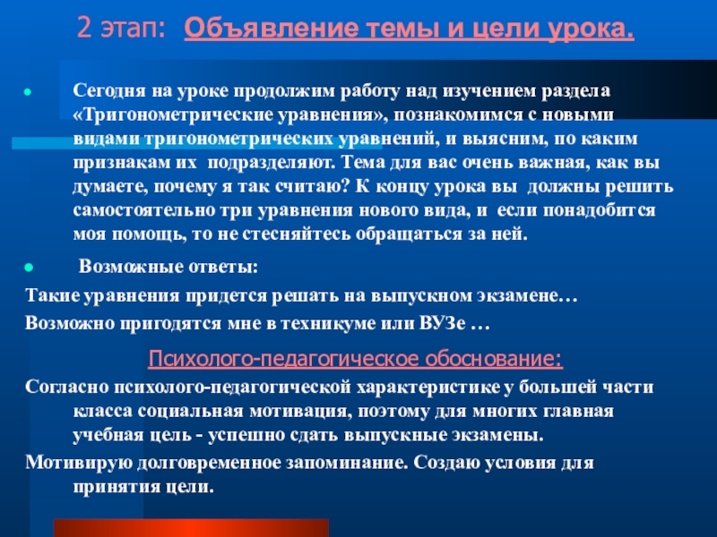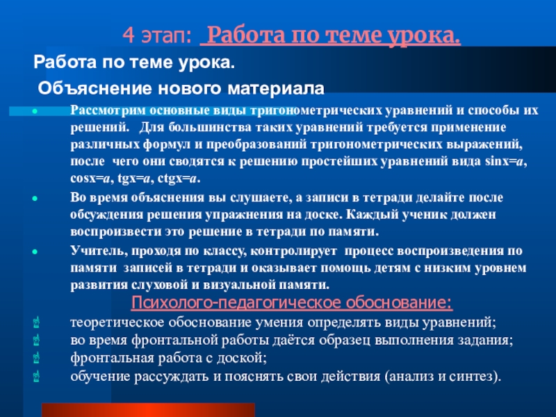 над изучением раздела «Тригонометрические уравнения», познакомимся с новыми видами тригонометрических уравнений, и выясним, по каким признакам их подразделяют. Тема для вас очень важная, как вы думаете, почему я так считаю? К концу урока вы должны решить самостоятельно три уравнения нового вида, и если понадобится моя помощь, то не стесняйтесь обращаться за ней.