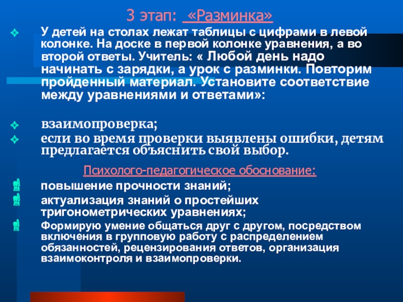 обосновывает ход рассуждений в процессе совместного с учителем решения тригонометрического уравнения.