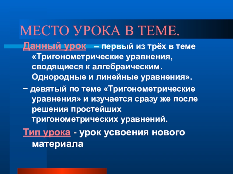 − девятый по теме «Тригонометрические уравнения» и изучается сразу же после решения простейших тригонометрических уравнений.