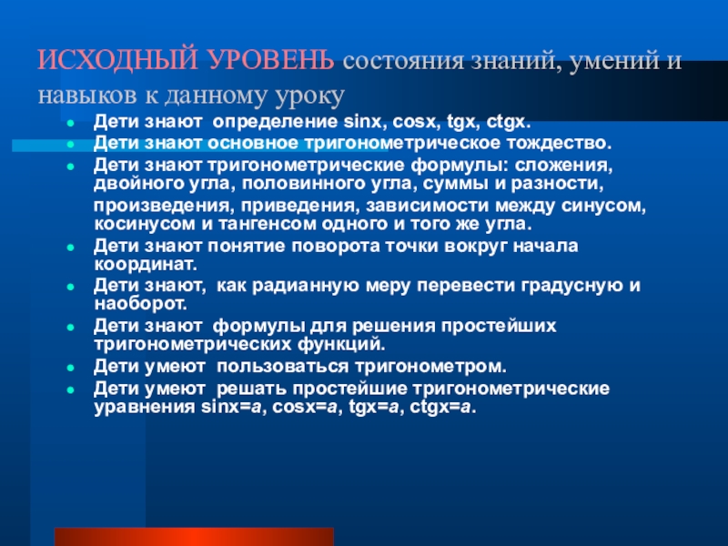 Слайд 5ИСХОДНЫЙ УРОВЕНЬ состояния знаний, умений и навыков к данному уроку