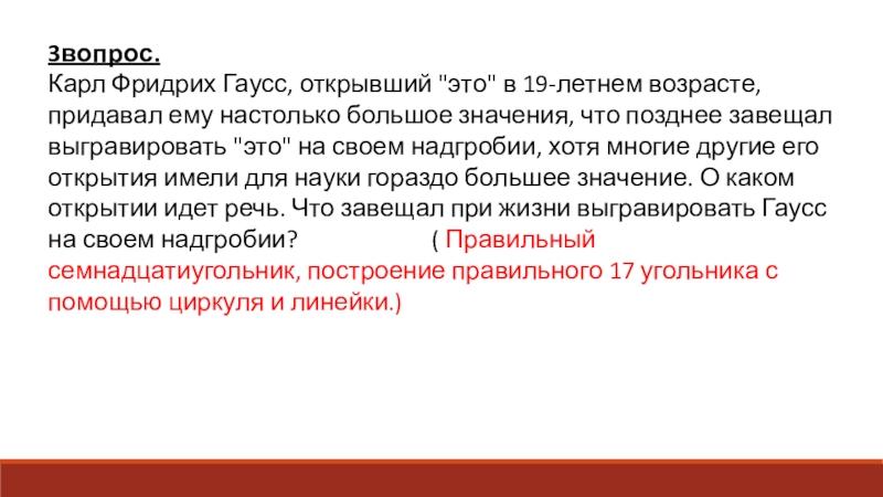 настолько большое значения, что позднее завещал выгравировать "это" на своем надгробии, хотя многие другие его открытия имели для науки гораздо большее значение. О каком открытии идет речь. Что завещал при жизни выгравировать Гаусс на своем надгробии? ( Правильный семнадцатиугольник, построение правильного 17 угольника с помощью циркуля и линейки.)
