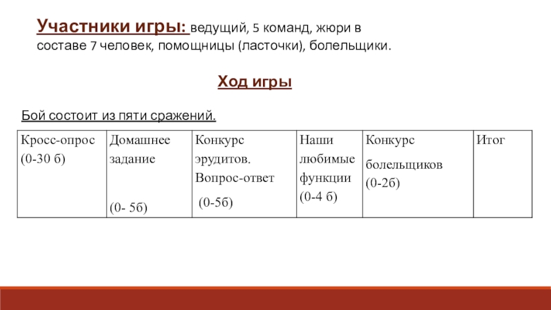Слайд 4Участники игры: ведущий, 5 команд, жюри в составе 7 человек, помощницы