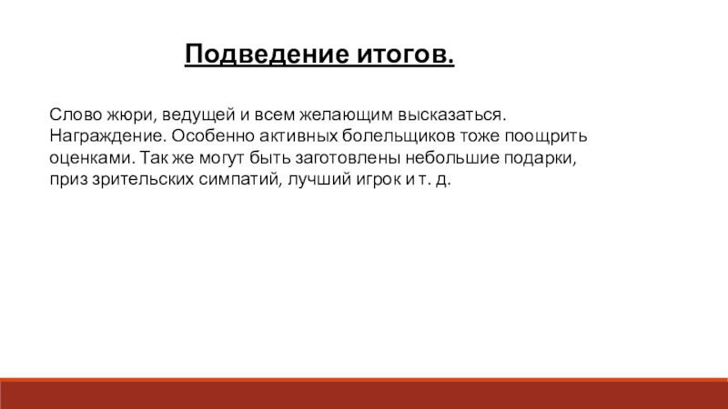 болельщиков тоже поощрить оценками. Так же могут быть заготовлены небольшие подарки, приз зрительских симпатий, лучший игрок и т. д.