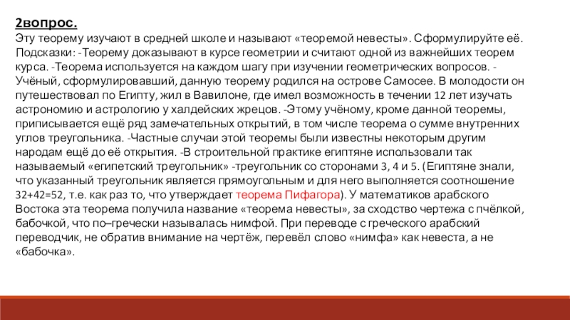 Сформулируйте её. Подсказки: -Теорему доказывают в курсе геометрии и считают одной из важнейших теорем курса. -Теорема используется на каждом шагу при изучении геометрических вопросов. -Учёный, сформулировавший, данную теорему родился на острове Самосее. В молодости он путешествовал по Египту, жил в Вавилоне, где имел возможность в течении 12 лет изучать астрономию и астрологию у халдейских жрецов. -Этому учёному, кроме данной теоремы, приписывается ещё ряд замечательных открытий, в том числе теорема о сумме внутренних углов треугольника. -Частные случаи этой теоремы были известны некоторым другим народам ещё до её открытия. -В строительной практике египтяне использовали так называемый «египетский треугольник» -треугольник со сторонами 3, 4 и 5. (Египтяне знали, что указанный треугольник является прямоугольным и для него выполняется соотношение 32+42=52, т.е. как раз то, что утверждает теорема Пифагора). У математиков арабского Востока эта теорема получила название «теорема невесты», за сходство чертежа с пчёлкой, бабочкой, что по–гречески называлась нимфой. При переводе с греческого арабский переводчик, не обратив внимание на чертёж, перевёл слово «нимфа» как невеста, а не «бабочка».