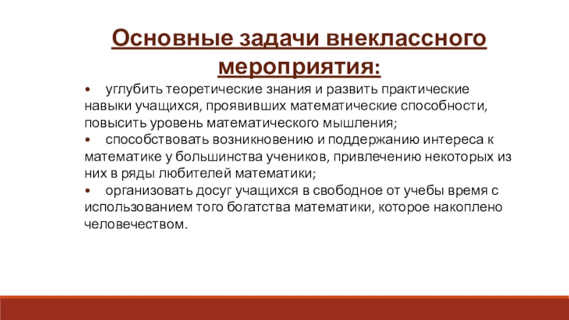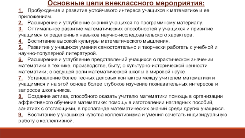 • организовать досуг учащихся в свободное от учебы время с использованием того богатства математики, которое накоплено человечеством.