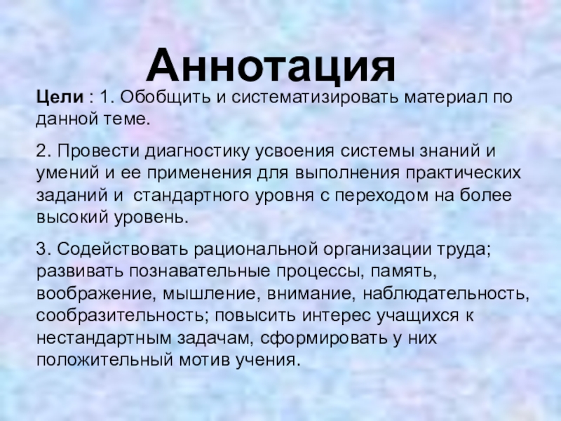 АннотацияЦели : 1. Обобщить и систематизировать материал по данной теме.2. Провести диагностику усвоения системы знаний и умений и ее применения для выполнения практических заданий и стандартного уровня с переходом на более высокий уровень.3. Содействовать рациональной организации