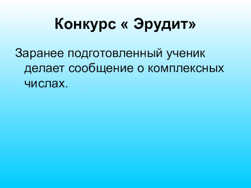 Конкурс « Эрудит»Заранее подготовленный ученик делает сообщение о комплексных числах.