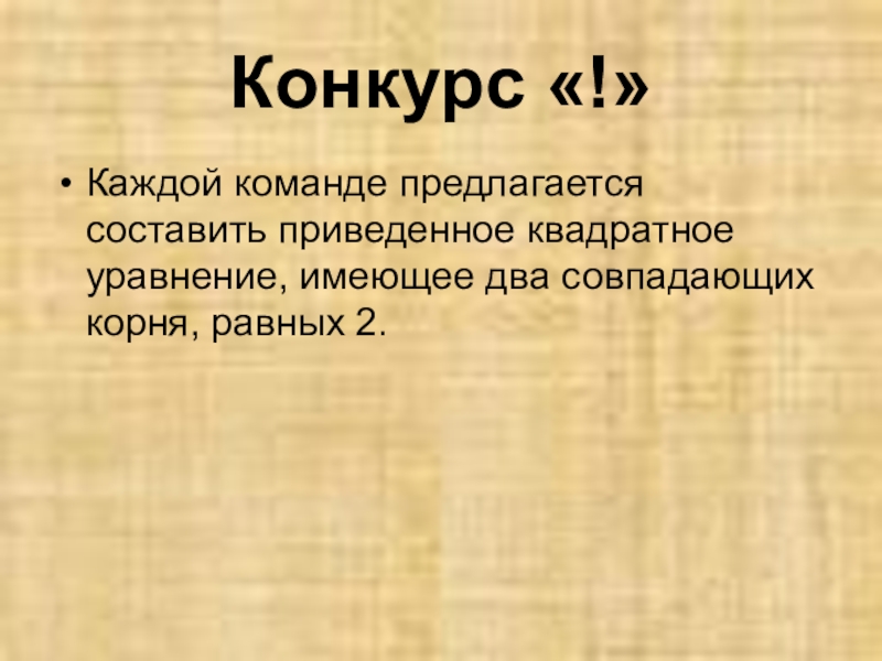 Конкурс «!»Каждой команде предлагается составить приведенное квадратное уравнение, имеющее два совпадающих корня, равных 2.