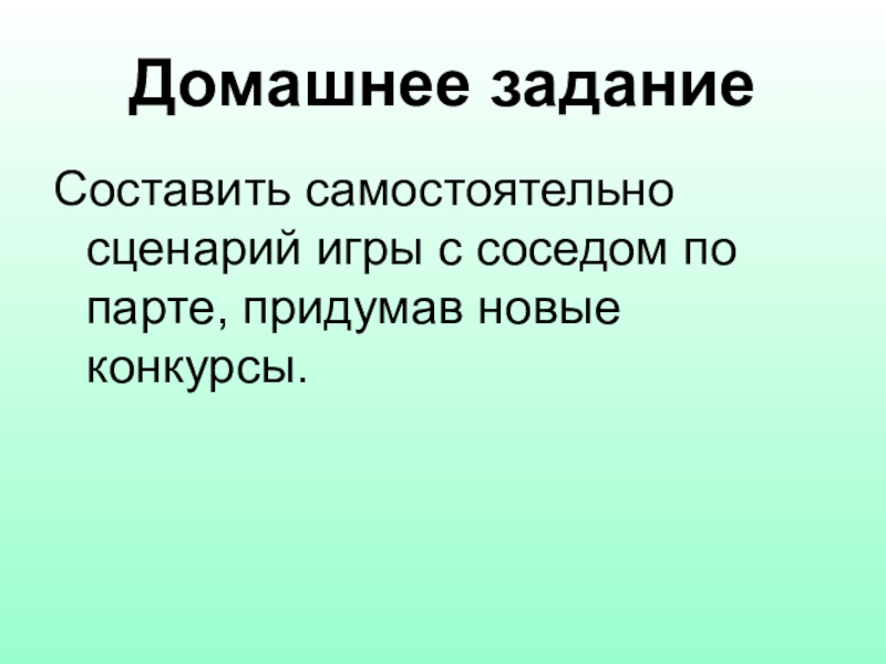 Домашнее заданиеСоставить самостоятельно сценарий игры с соседом по парте, придумав новые конкурсы.