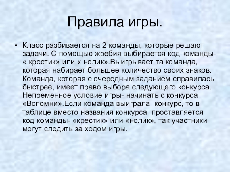 Правила игры.Класс разбивается на 2 команды, которые решают задачи. С помощью жребия выбирается код команды- « крестик»