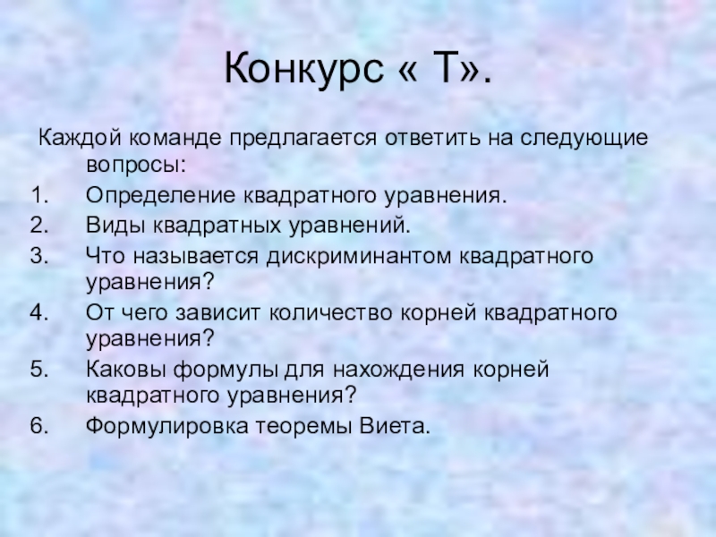Конкурс « Т».Каждой команде предлагается ответить на следующие вопросы:Определение квадратного уравнения.Виды квадратных уравнений.Что называется дискриминантом квадратного уравнения?От