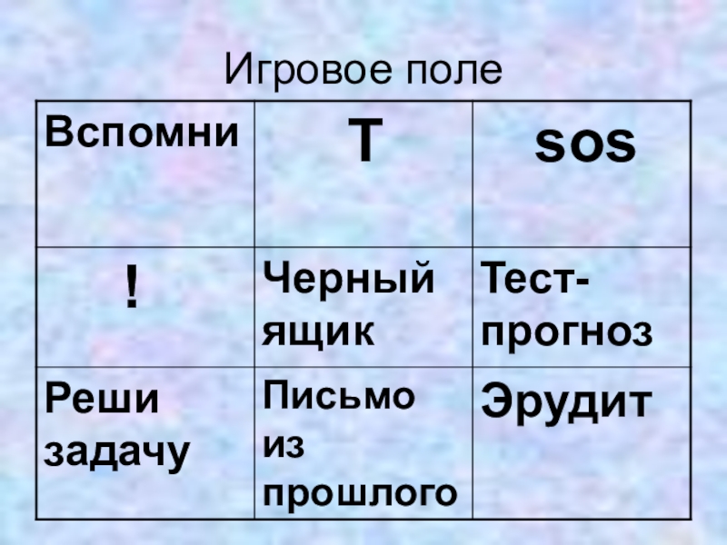 жребия выбирается код команды- « крестик» или « нолик».Выигрывает та команда, которая набирает большее количество своих знаков. Команда, которая с очередным заданием справилась быстрее, имеет право выбора следующего конкурса. Непременное условие игры- начинать с конкурса «Вспомни».Если команда выиграла конкурс, то в таблице вместо названия конкурса проставляется код команды- «крестик» или «нолик», так участники могут следить за ходом игры.