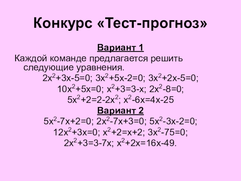 Конкурс «Тест-прогноз»Вариант 1Каждой команде предлагается решить следующие уравнения.2x2+3x-5=0; 3x2+5x-2=0; 3x2+2x-5=0;10x2+5x=0; x2+3=3-x; 2x2-8=0;5x2+2=2-2x2; x2-6x=4x-25Вариант 25x2-7x+2=0; 2x2-7x+3=0; 5x2-3x-2=0;12x2+3x=0; x2+2=x+2;