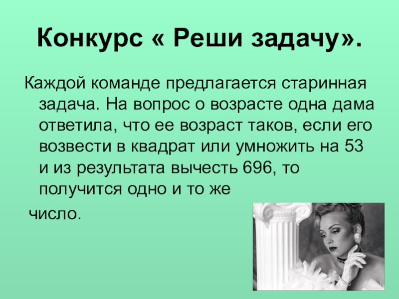 Конкурс « Реши задачу».Каждой команде предлагается старинная задача. На вопрос о возрасте одна дама ответила, что ее