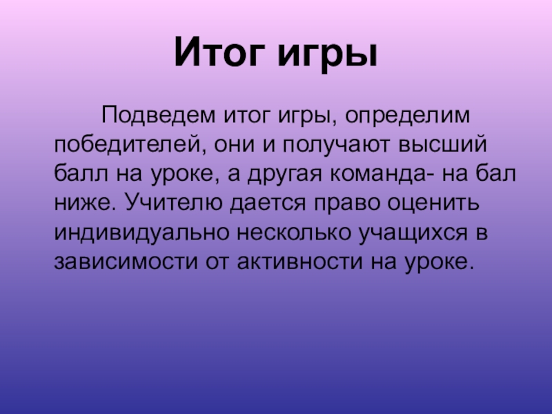 Итог игры     Подведем итог игры, определим победителей, они и получают высший балл на