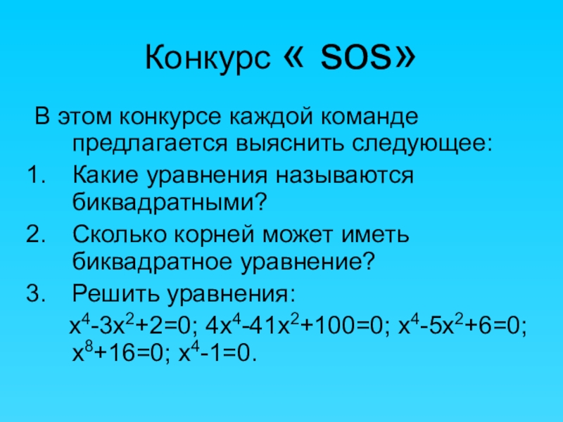 Конкурс « sos»В этом конкурсе каждой команде предлагается выяснить следующее:Какие уравнения называются биквадратными?Сколько корней может иметь биквадратное
