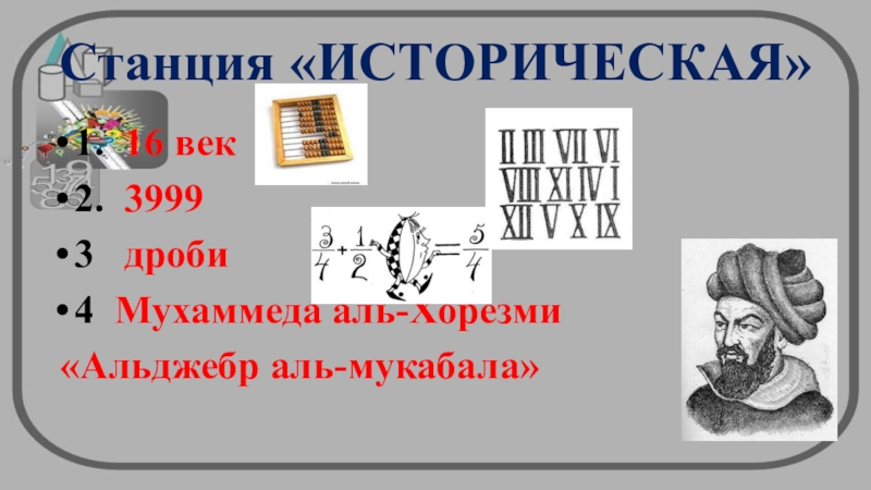 Станция «ИСТОРИЧЕСКАЯ»1. 16 век 2. 3999 3 дроби 4 Мухаммеда аль-Хорезми «Альджебр аль-мукабала»