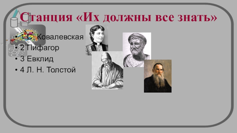 Станция «Их должны все знать»1 С. Ковалевская 2 Пифагор3 Евклид4 Л. Н. Толстой