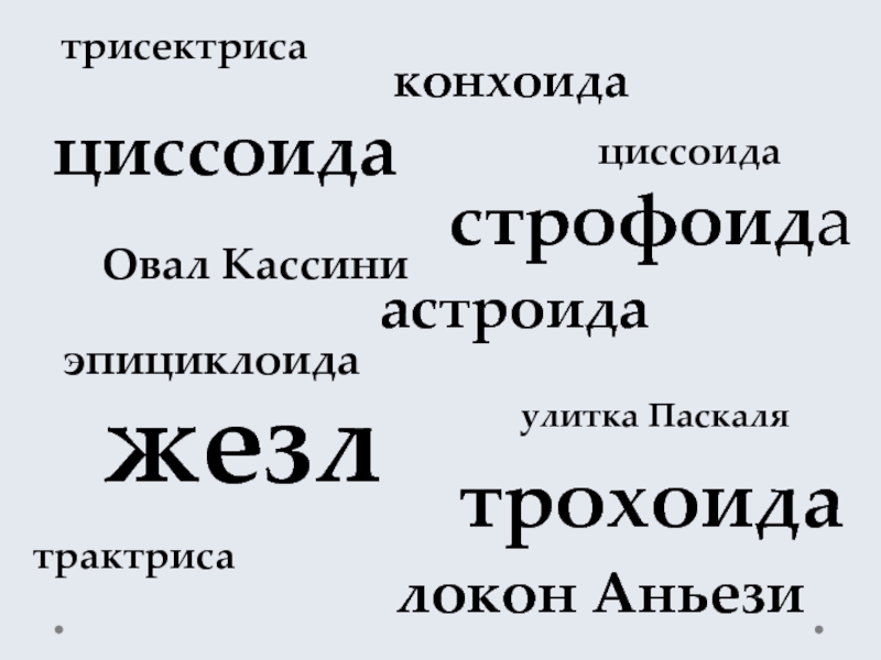 циссоидаастроидажезлконхоидалокон АньезиОвал Кассинистрофоидатрактрисатрохоидатрисектрисаулитка Паскаляциссоидаэпициклоида