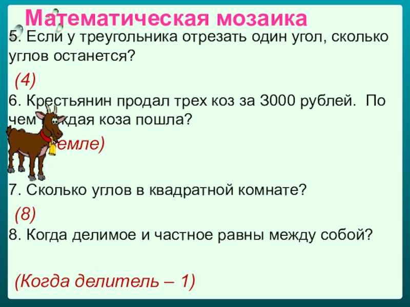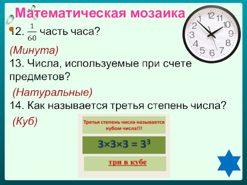 Выбрав раздел математики, в котором он ориентируется лучше всего, отвечает на вопросы из этого раздела ровно одну минуту.