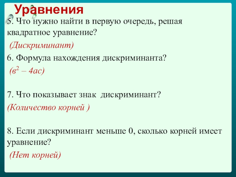 5. Что нужно найти в первую очередь, решая квадратное уравнение?
