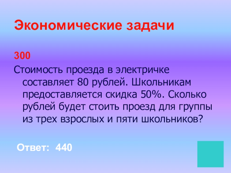Экономические задачи300Стоимость проезда в электричке составляет 80 рублей. Школьникам предоставляется скидка 50%. Сколько рублей будет стоить проезд для группы из