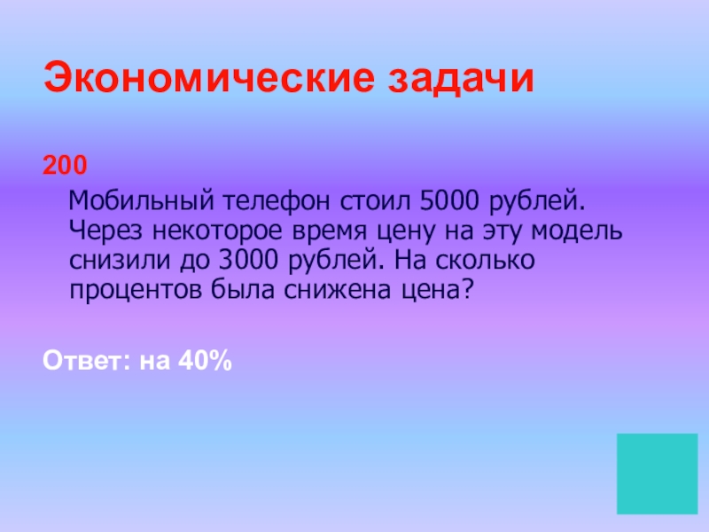 Экономические задачи200  Мобильный телефон стоил 5000 рублей. Через некоторое время цену на эту модель снизили до