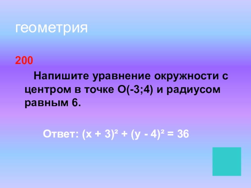 геометрия200   Напишите уравнение окружности с центром в точке О(-3;4) и радиусом равным 6.
