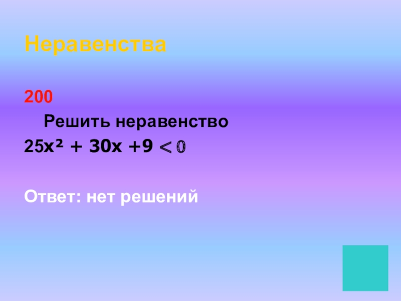 Неравенства200  Решить неравенство25х² + 30x +9 < 0 Ответ: нет решений
