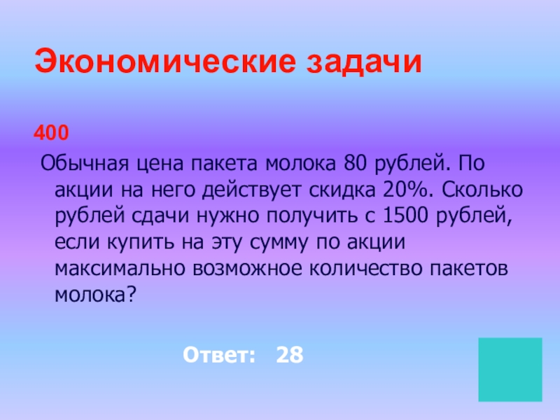 Экономические задачи400 Обычная цена пакета молока 80 рублей. По акции на него действует скидка 20%. Сколько рублей сдачи нужно получить