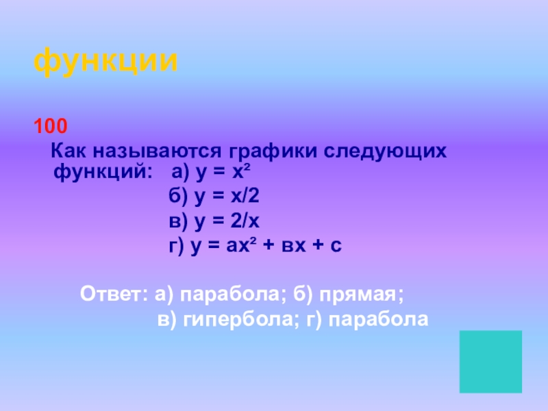 функции100  Как называются графики следующих функций:  а) у = х²