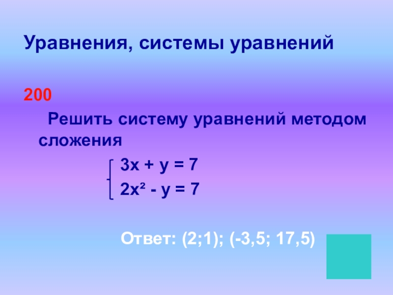 Уравнения, системы уравнений200   Решить систему уравнений методом сложения