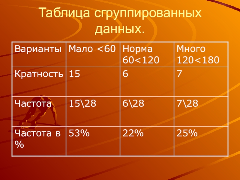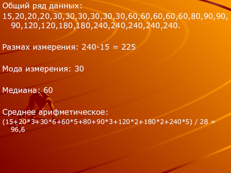 Общий ряд данных:15,20,20,20,30,30,30,30,30,30,60,60,60,60,60,80,90,90,90,120,120,180,180,240,240,240,240,240.Размах измерения: 240-15 = 225Мода измерения: 30Медиана: 60Среднее арифметическое:(15+20*3+30*6+60*5+80+90*3+120*2+180*2+240*5) / 28 = 96,6