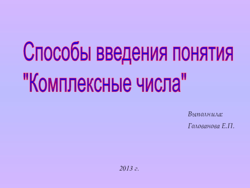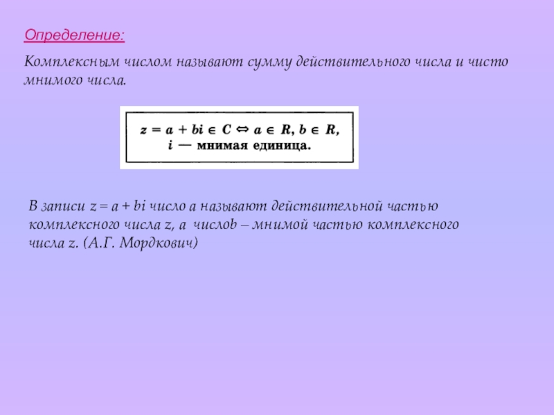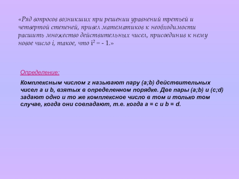 Комплексными числами называют упорядоченные пары (a, b) действительных чисел а и b, для которых следующим образом определены понятие равенства и опреации сложения и умножения. (М. И. Шабунин)