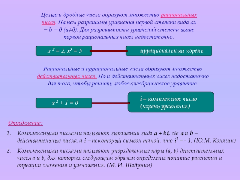 Комплексными числами называют выражения вида а + bi, где а и b – действительные числа, а i – некоторый символ такой, что i2 = - 1. (Ю.М. Колягин)