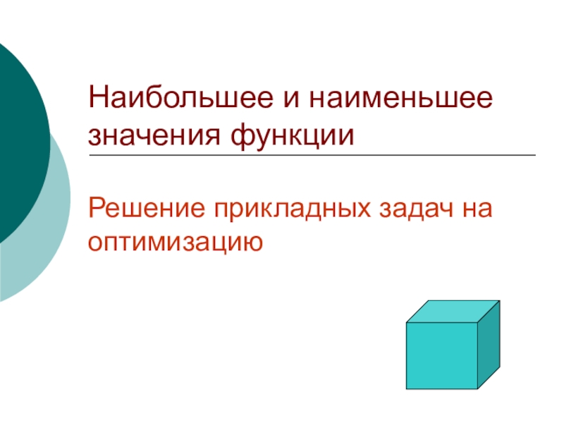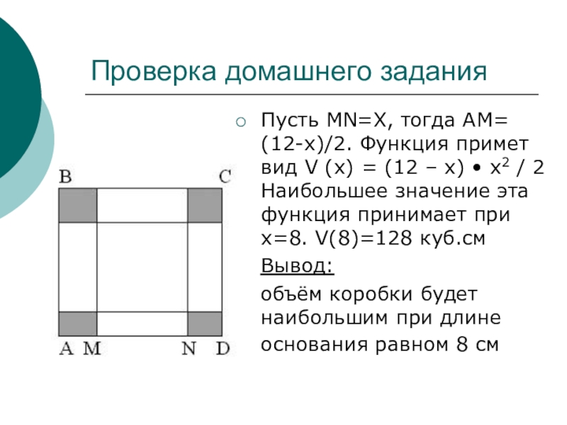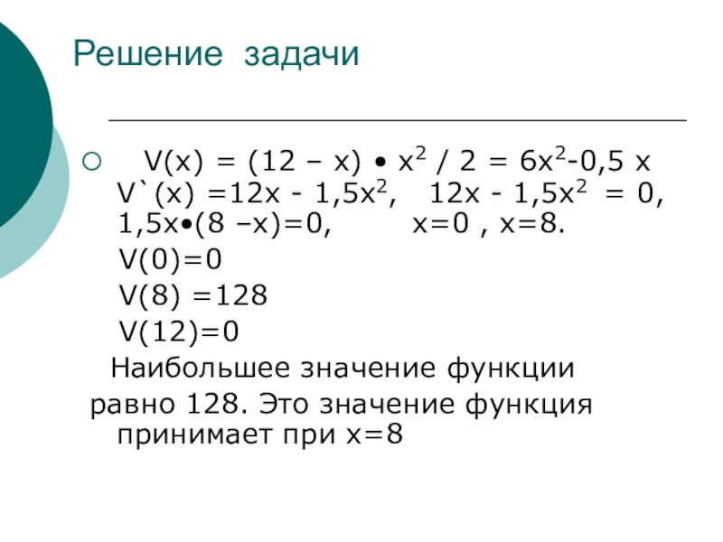 (x) = (12 – x) • х2 / 2 Наибольшее значение эта функция принимает при х=8. V(8)=128 куб.см