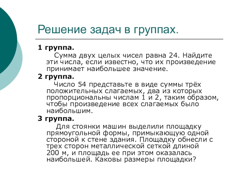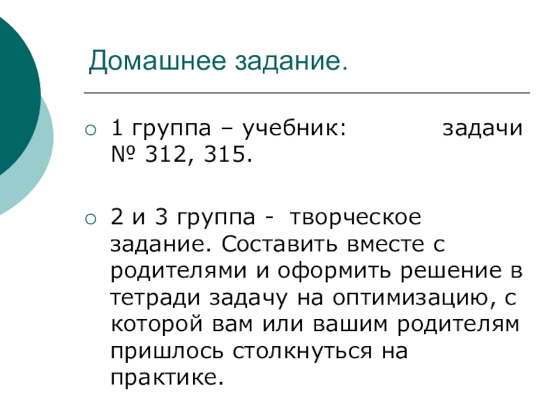 2 и 3 группа - творческое задание. Составить вместе с родителями и оформить решение в тетради задачу на оптимизацию, с которой вам или вашим родителям пришлось столкнуться на практике.