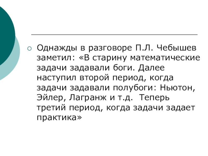Однажды в разговоре П.Л. Чебышев заметил: «В старину математические задачи задавали