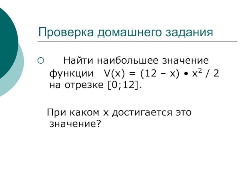 (12 – x) • х2 / 2 на отрезке [0;12].