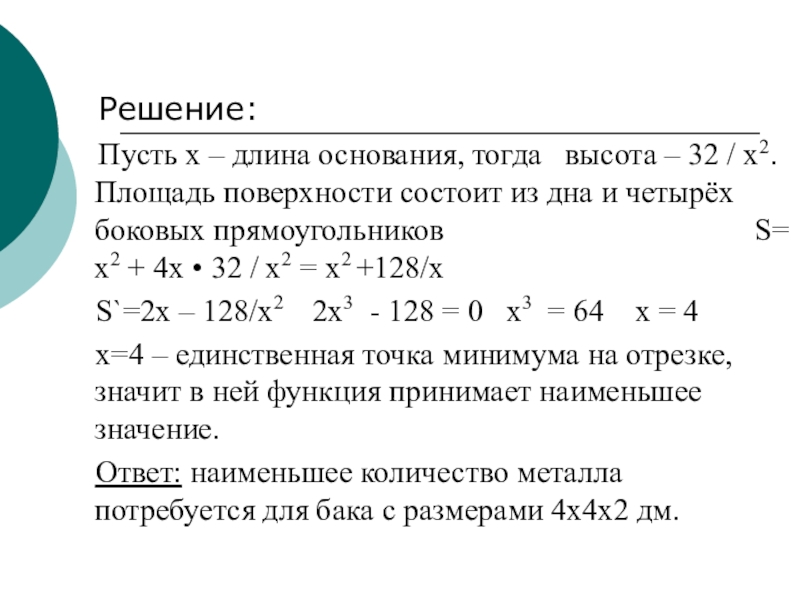высота – 32 / х2. Площадь поверхности состоит из дна и четырёх боковых прямоугольников S= х2 + 4х • 32 / х2 = х2 +128/х