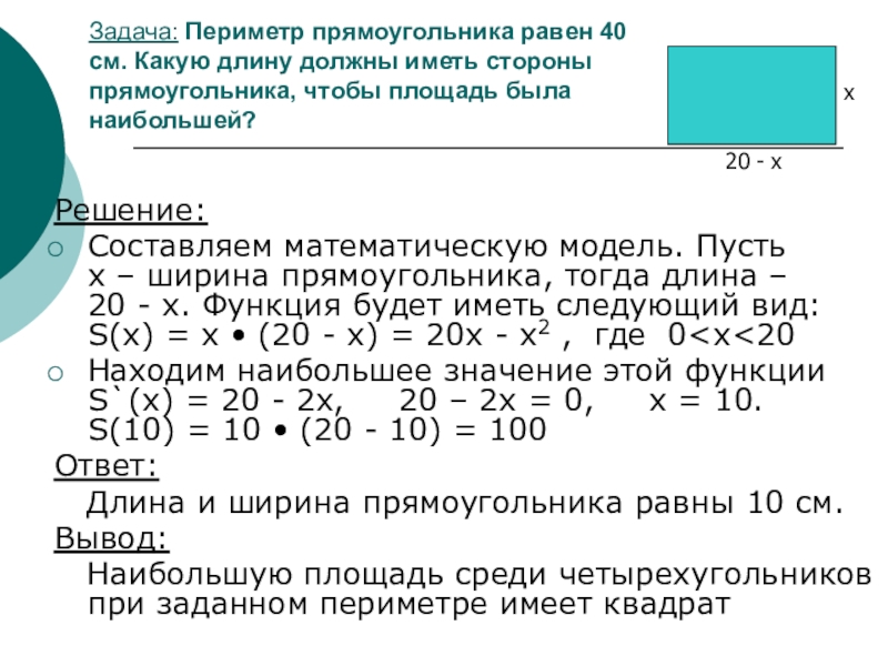 Составляем математическую модель. Пусть х – ширина прямоугольника, тогда длина – 20 - х. Функция будет иметь следующий вид: S(x) = x • (20 - x) = 20x - x2 , где 0Находим наибольшее значение этой функции S`(x) = 20 - 2x, 20 – 2x = 0, x = 10. S(10) = 10 • (20 - 10) = 100