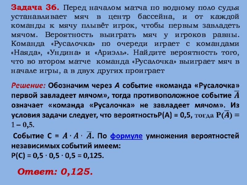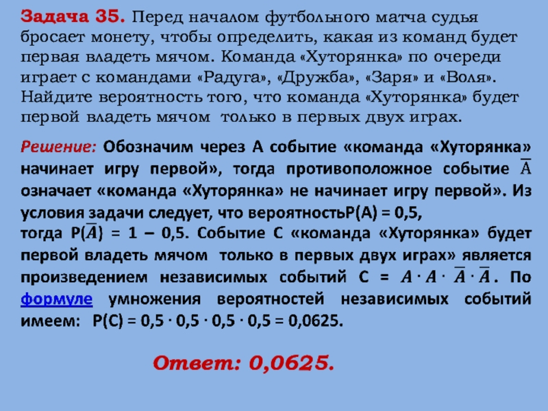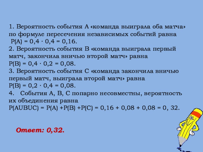 1. Вероятность события А «команда выиграла оба матча» по формуле пересечения независимых событий равна