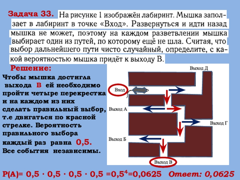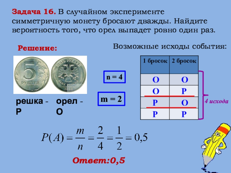 Р(А)= 0,5 ∙ 0,5 ∙ 0,5 ∙ 0,5 =0,54=0,0625