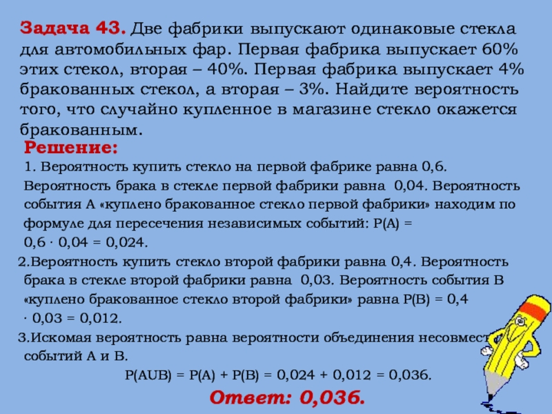 Вероятность купить стекло второй фабрики равна 0,4. Вероятность брака в стекле второй фабрики равна 0,03. Вероятность события В «куплено бракованное стекло второй фабрики» равна Р(В) = 0,4 · 0,03 = 0,012.