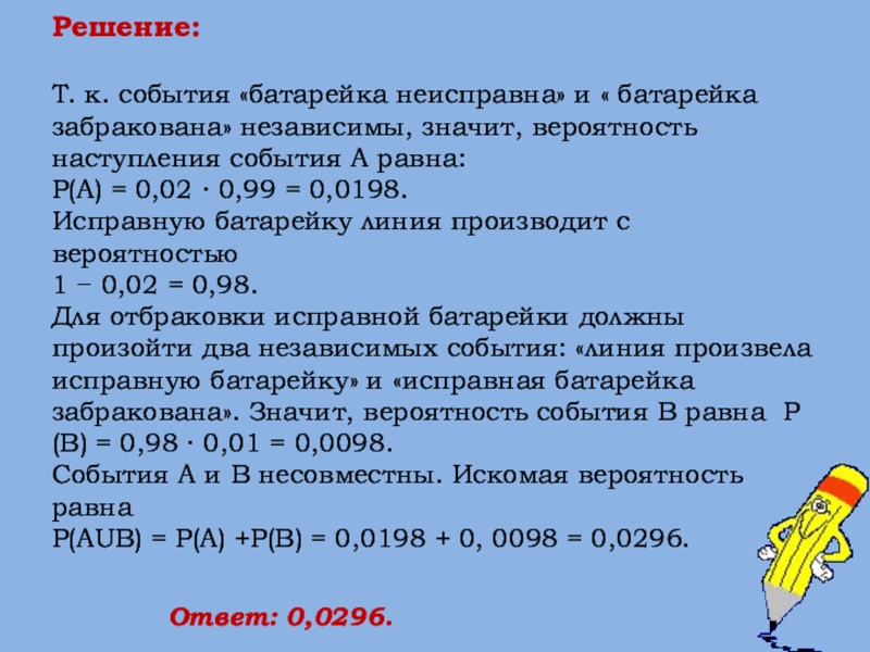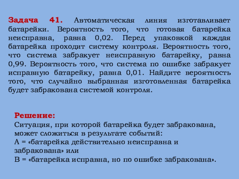 Задача 41. Автоматическая линия изготавливает батарейки. Вероятность того, что готовая батарейка неисправна, равна 0,02. Перед упаковкой каждая батарейка проходит систему контроля. Вероятность того, что система забракует неисправную батарейку, равна 0,99. Вероятность того, что система по ошибке забракует исправную батарейку, равна 0,01. Найдите вероятность того, что случайно выбранная изготовленная батарейка будет забракована системой контроля.