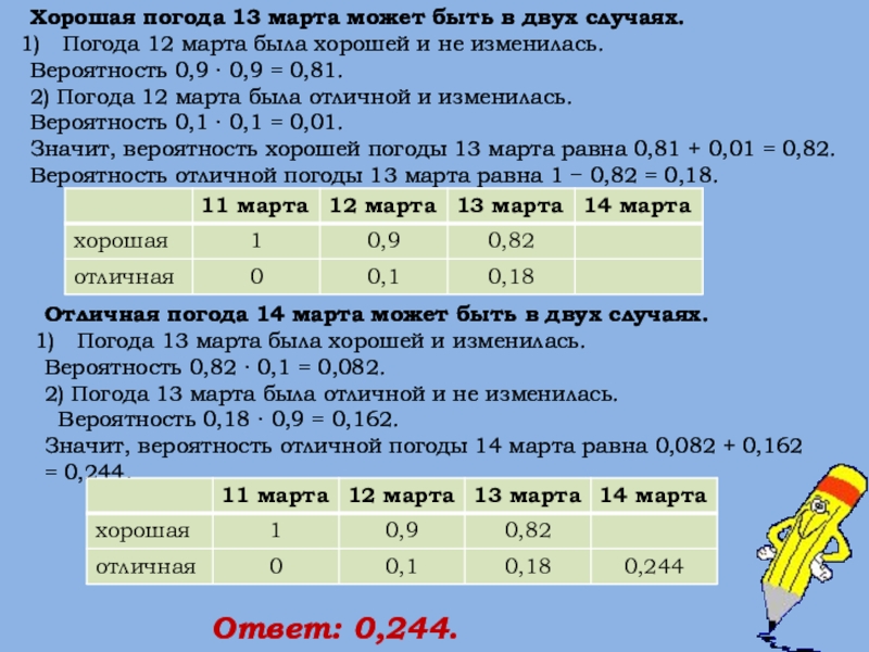 Значит, вероятность хорошей погоды 13 марта равна 0,81 + 0,01 = 0,82.